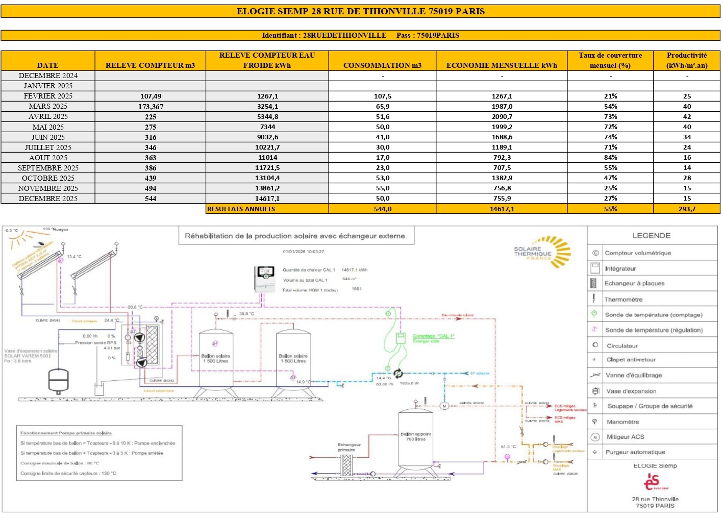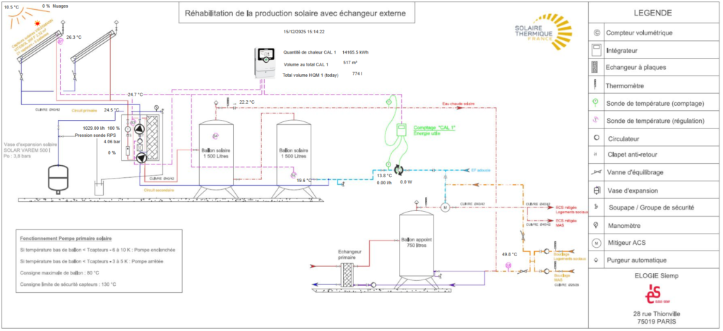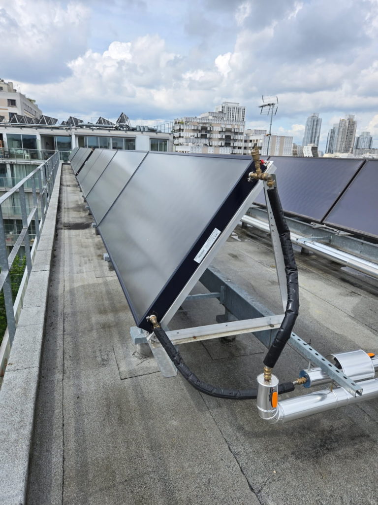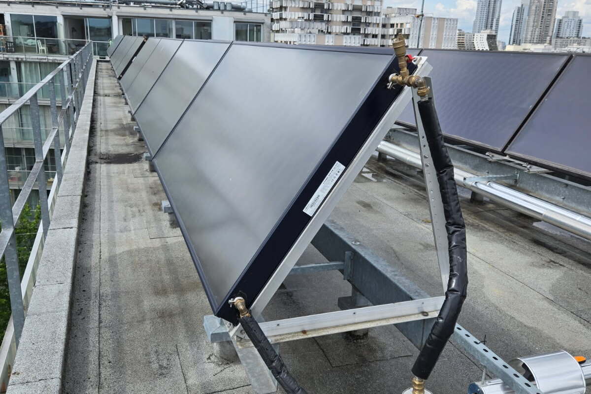 Solaire Thermique France est intervenue sur l’installation solaire thermique d’une des résidences gérées par le bailleur ELOGIE-Siemp, comprenant 30 logements. Il s’agit d’une installation solaire thermique pour la production d’eau chaude sanitaire, complétée par un appoint avec le réseau de chaleur urbain CPCU. Cette installation était à l’arrêt depuis plusieurs années.