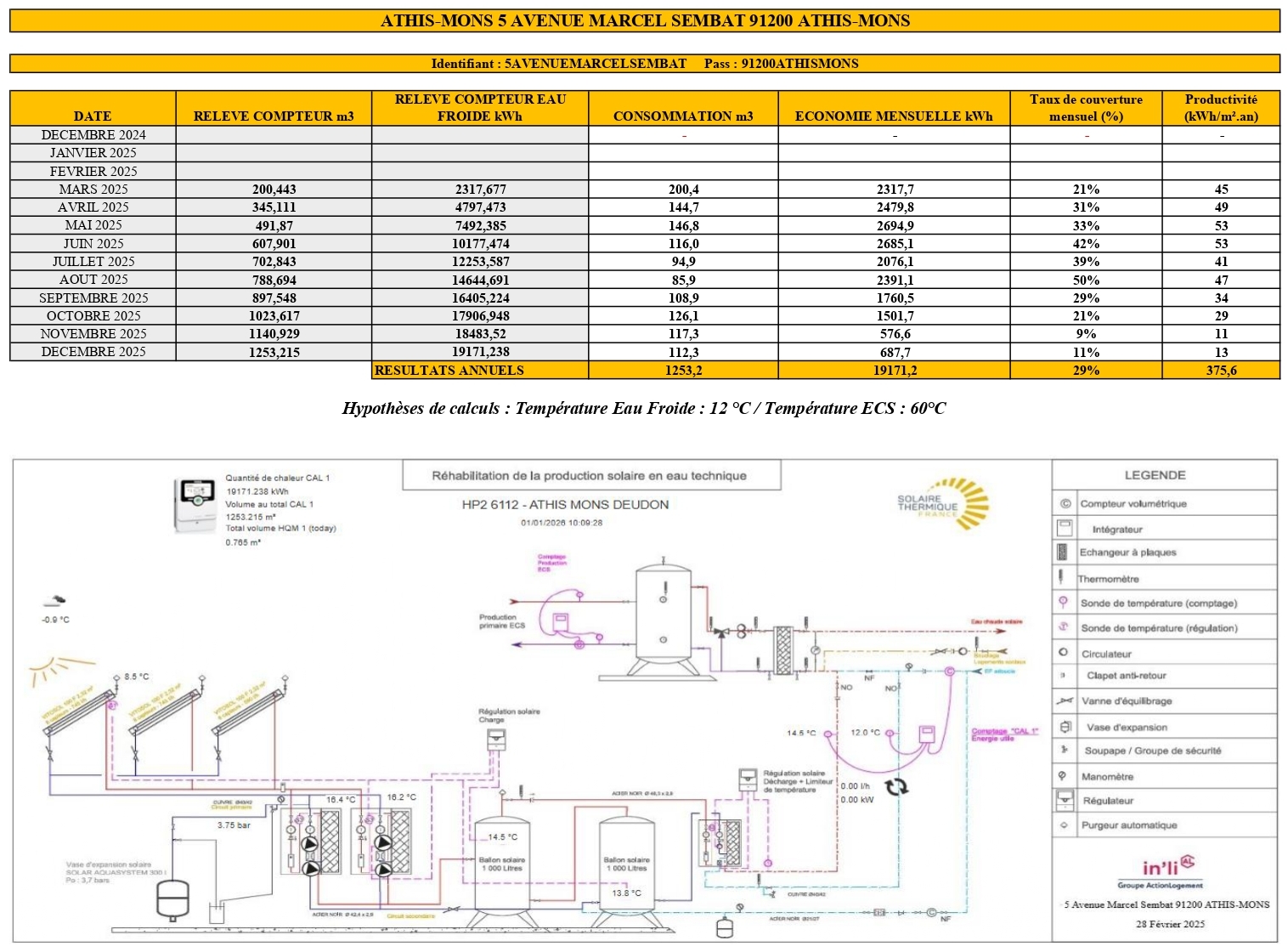 Depuis mars 2025, l’installation fonctionne parfaitement, produisant 11 MWh d’énergie gratuite en 7 mois.Depuis fin février 2025, l’installation fonctionne parfaitement, produisant 10 MWh d’énergie gratuite en 4 mois au PRINTEMPS ! Le taux de couverture était de plus de 40 % en Juin 2025, ceux attendus pour l’été sont de plus de 60%.